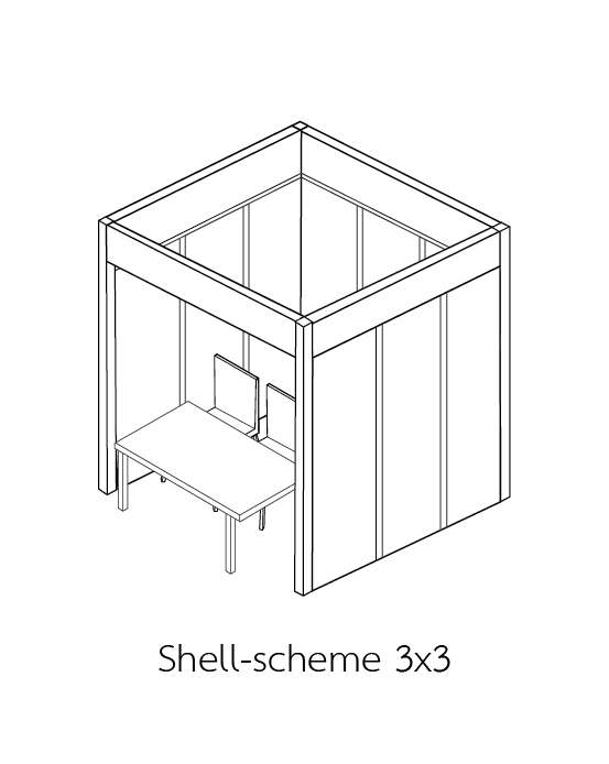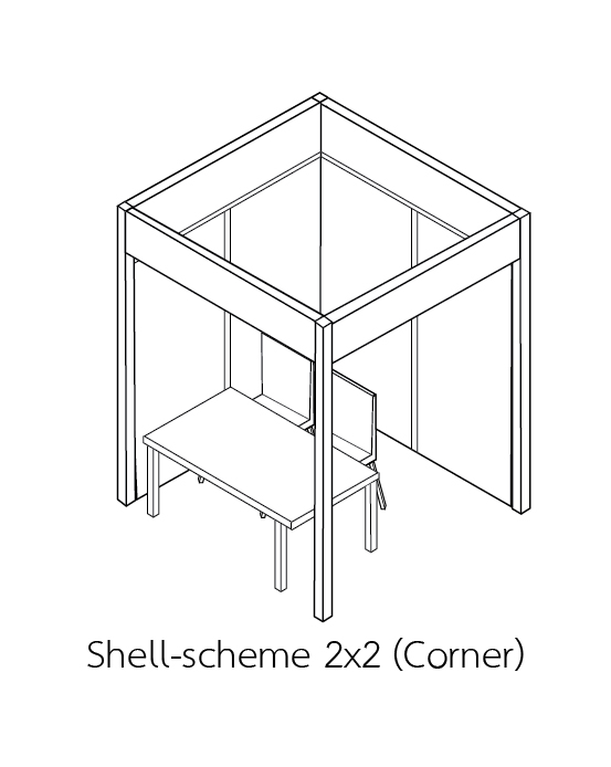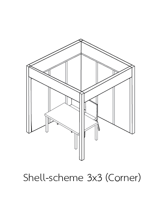 โครงสร้าง 3×3 (มุม) | 18,000฿ | 5 ใบ | 1 โต๊ะ (180×75 ซม.) + เก้าอี้ 2 ตัว + บูธโครงสร้างขนาด 3.0×3.0×2.4 ม. (กว้างxยาวxสูง) ตำแหน่งหัวมุม + ปลั๊กไฟ |