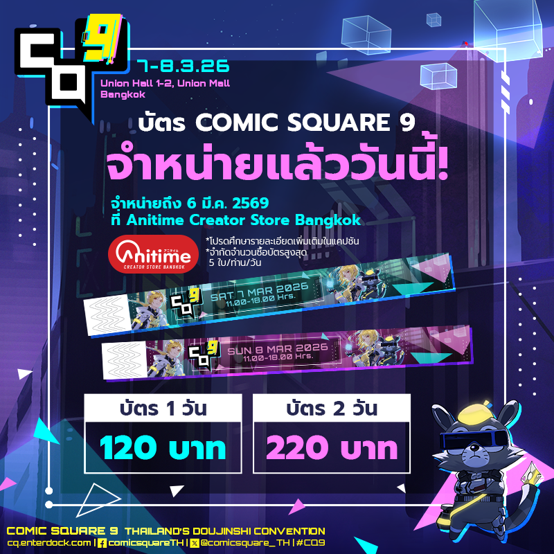- บัตรเข้าชมงานจำหน่าย ณ จุดจำหน่ายหน้าทางเข้างานในวันเสาร์และอาทิตย์ที่ 7-8 มีนาคม 2569 และจำหน่ายล่วงหน้าที่ร้าน Anitime Creator Store Bangkok ระหว่างเดือนกุมภาพันธ์ – มีนาคม 2569